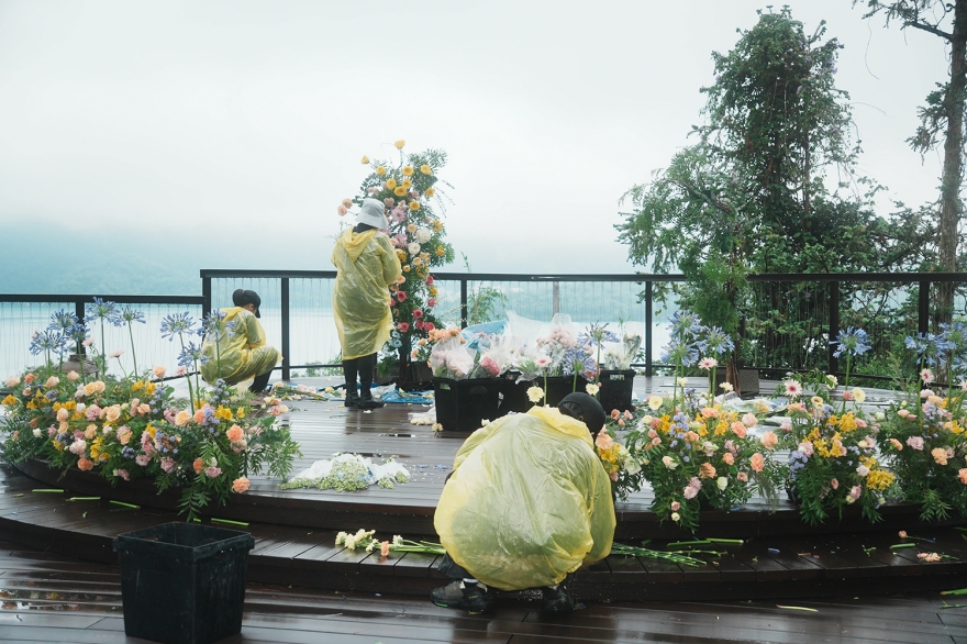 證婚小徑上,珊瑚粉與橘紅點綴在湖畔拱門