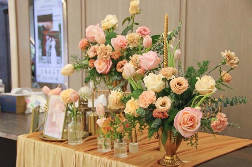 現在很多花藝師會以絹鮮 (真假)兩插的方式完成會場佈置婚宴現場
