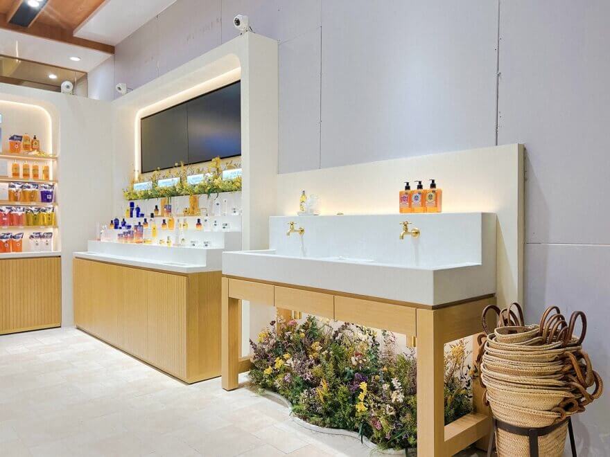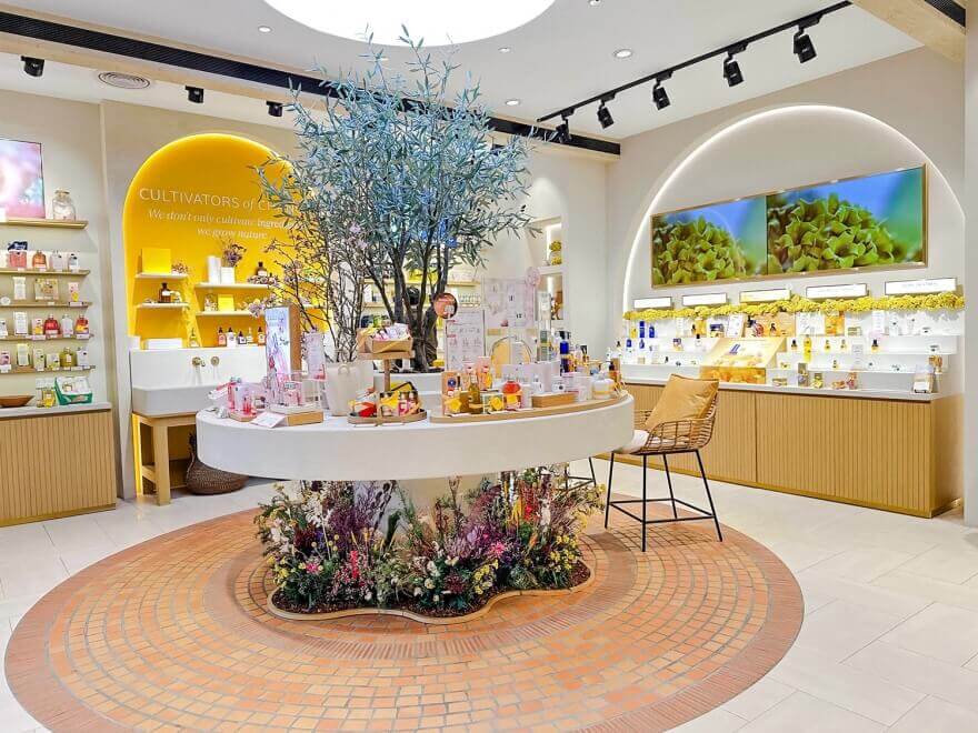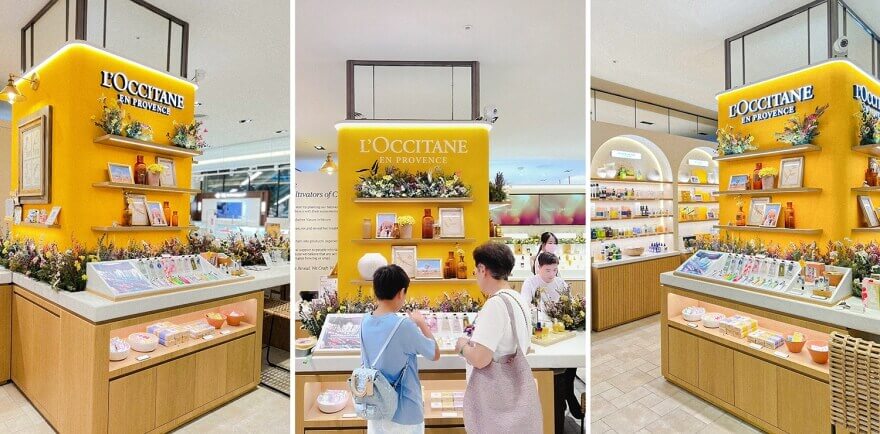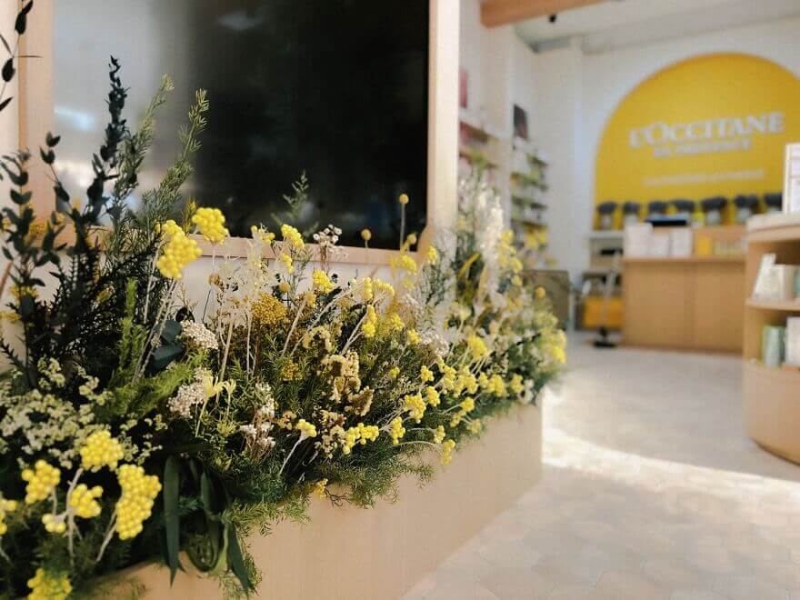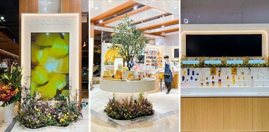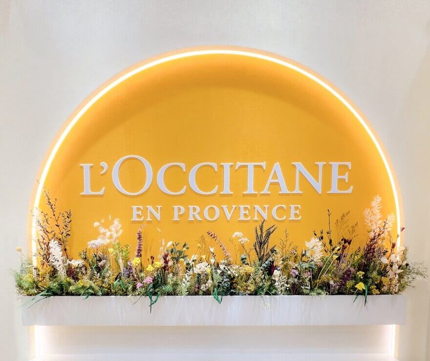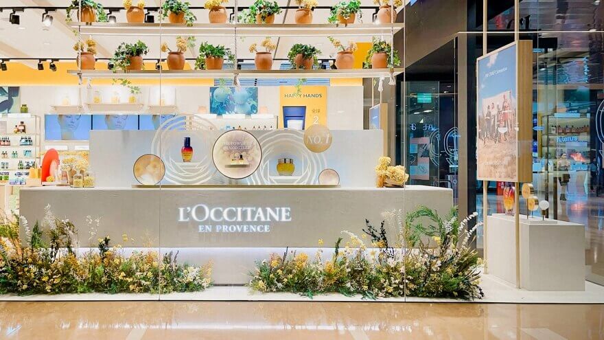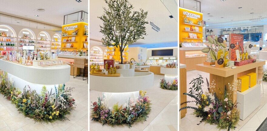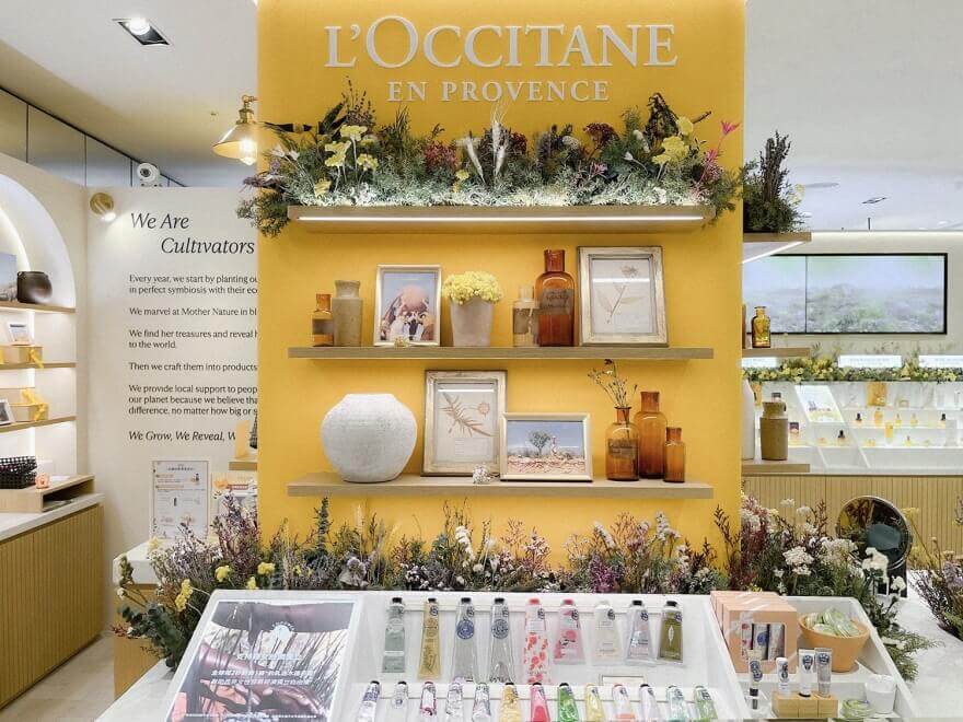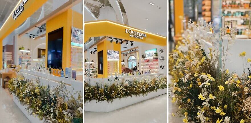 佈置中融入了歐舒丹標誌性的薰衣草色調與金黃色的臘菊