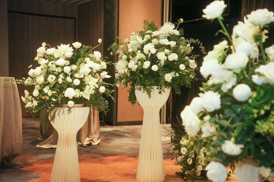 我們與新人討論後,保留台灣婚禮溫暖的氛圍,同時以白玫瑰、鐵炮百合與深淺綠葉的台灣花材為主體
