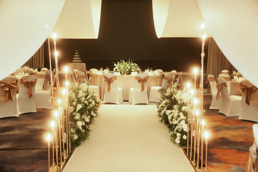 燈火倒映在潔白的走道上,讓新娘進場更顯乾淨明亮