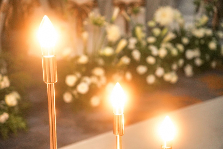 走道兩側以蠟燭光交織花香,將場地的挑高優勢發揮得淋漓盡致