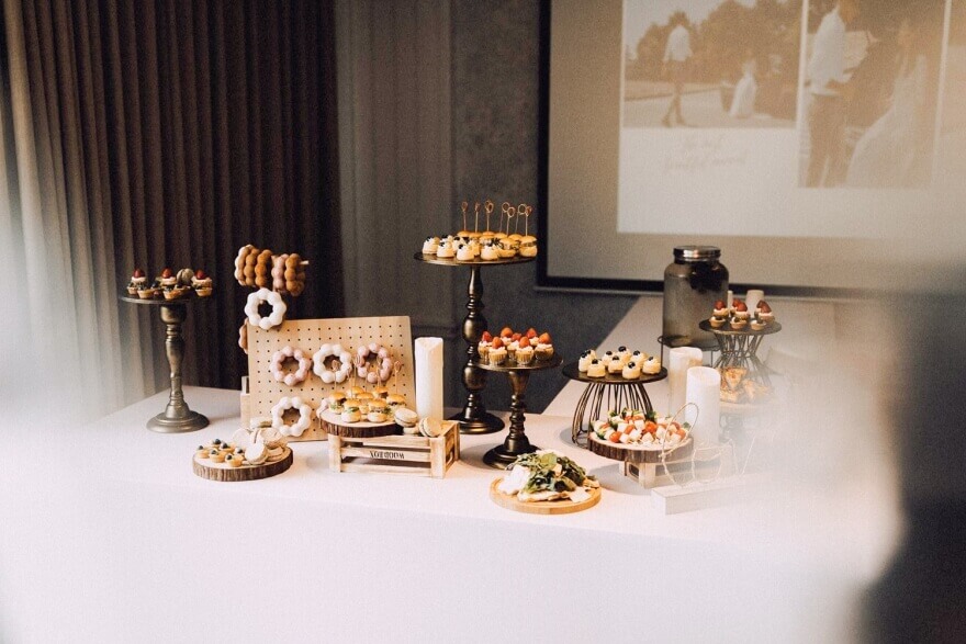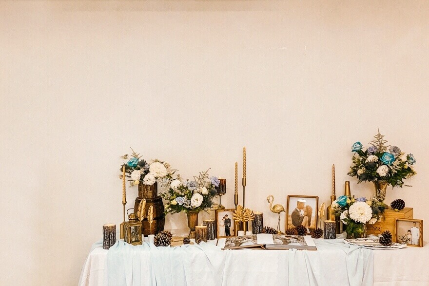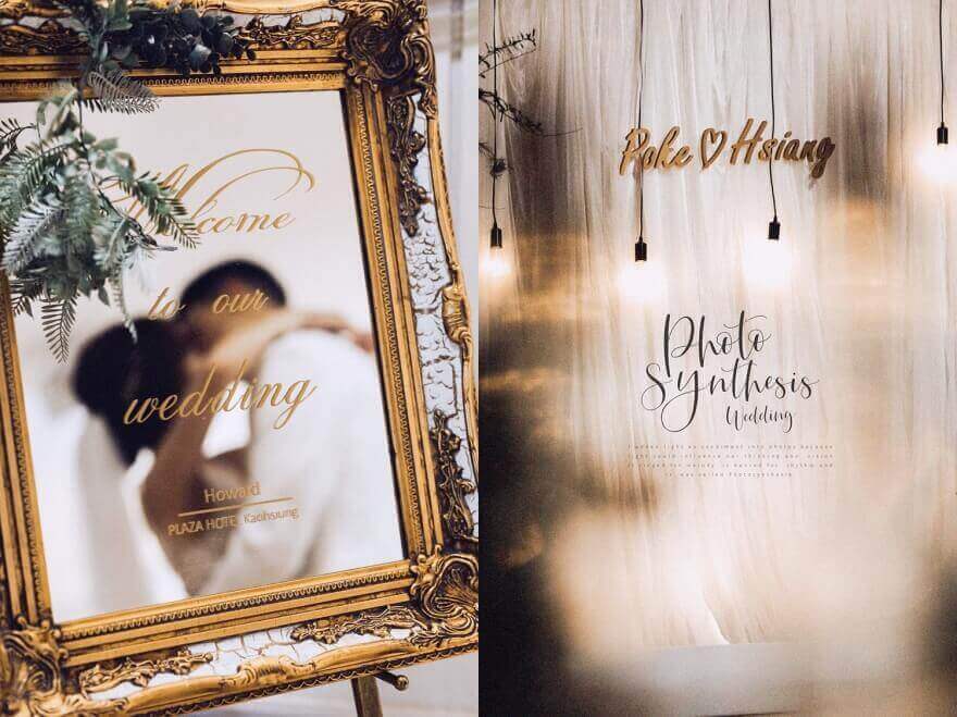 1. 宴會廳:好日子常常擠在一起,同日新人宴客多入口迎賓處及收禮桌一定要標示清楚,除了飯店附贈的電子看板及桌次圖打造特別的迎賓佈置也可以讓賓客從細節處感受到新人的用心